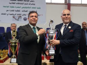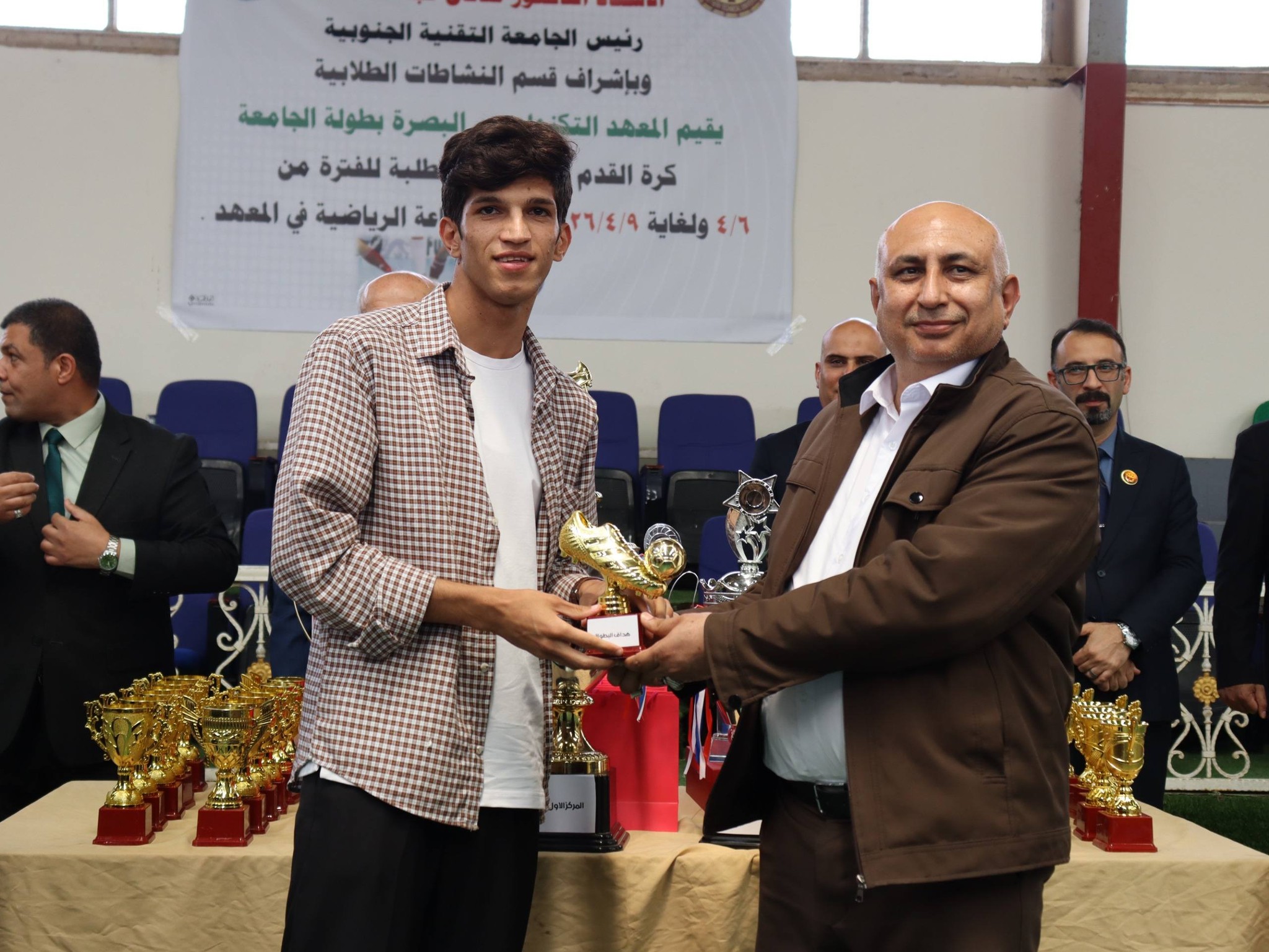 السيد رئيس الجامعة التقنية الجنوبية والسيد عميد المعهد التقني التكنولوجي في البصرة يكرمون الفريقين المشاركين في المباراة النهائية لبطولة الجامعة.