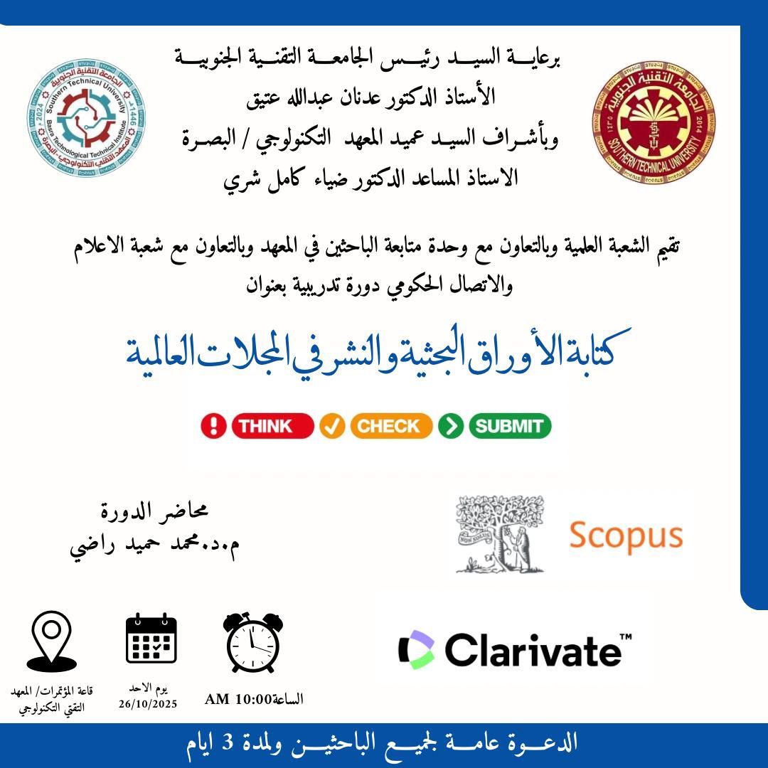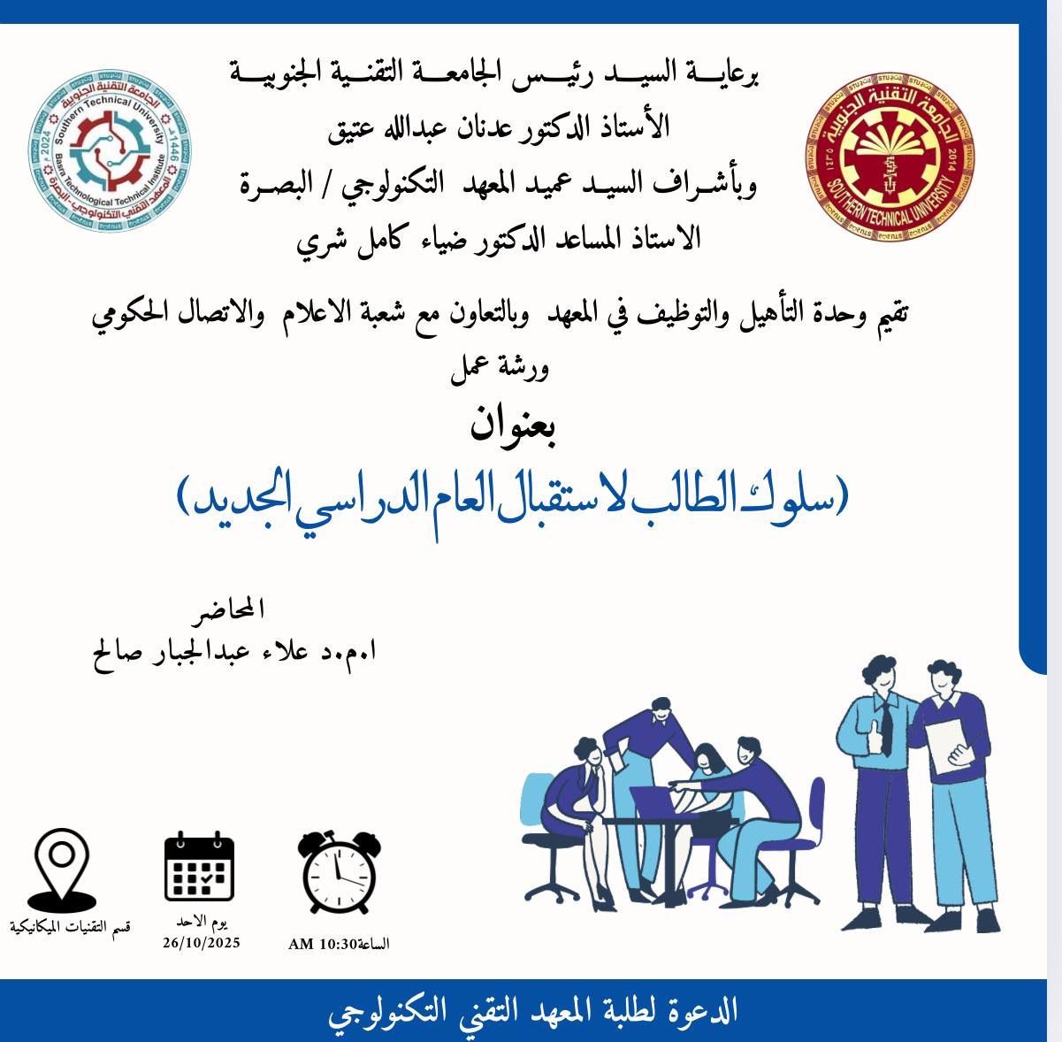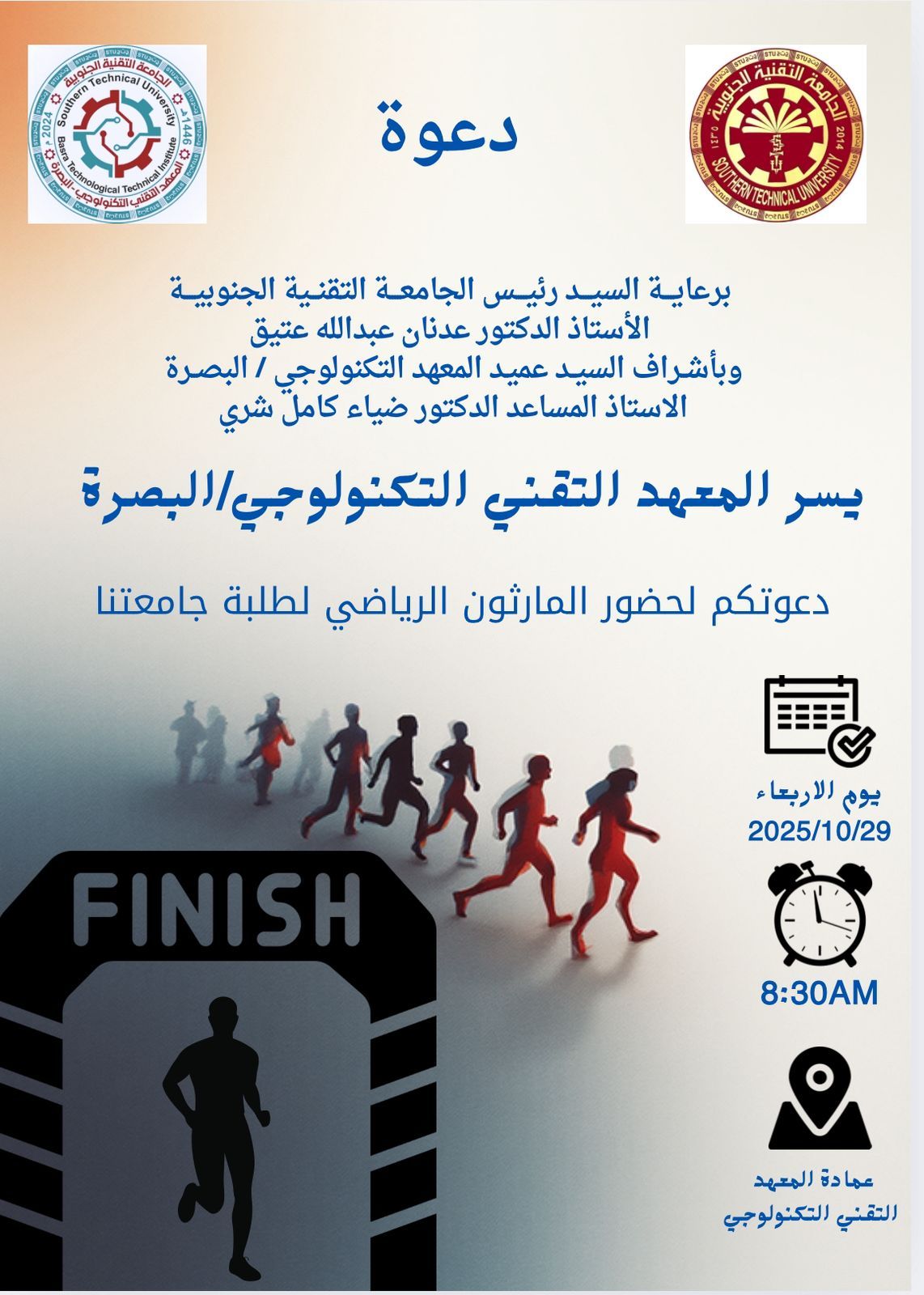 تعلن الجامعة التقنية الجنوبية / المعهد التقني التكنولوجي في البصرة عن إقامة مسابقة ماراثون الجامعة السنوي المخصص لطلاب تشكيلات البصرة حصراً، وذلك يوم الأربعاء المواف2025/10/29 بدلا من يوم الاثنين شروط الاشتراك في المسابقة: ارتداء الزي الرياضي الكامل، على أن يختلف زي كل تشكيل عن الآخر. […]