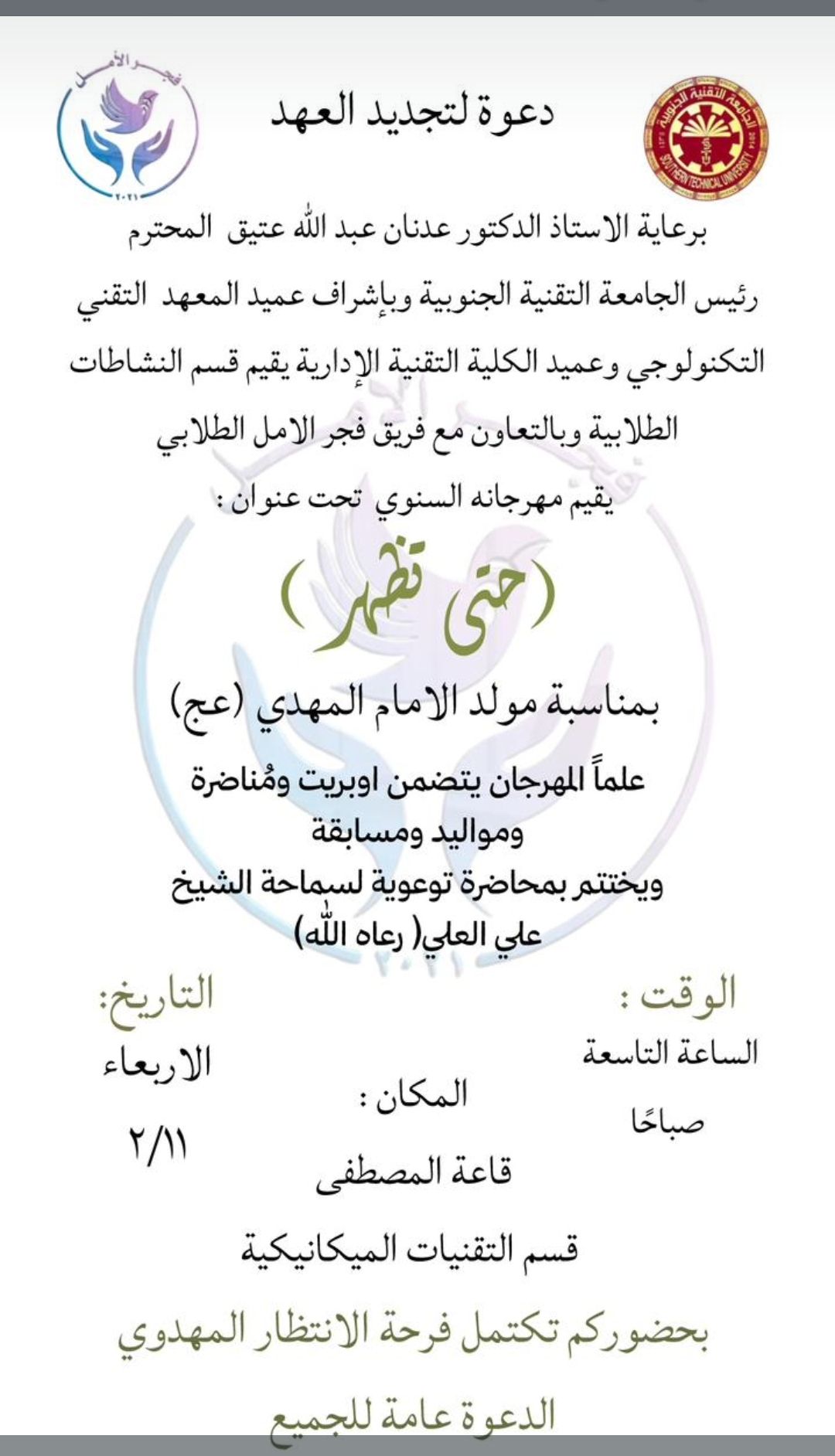 برعاية السيد عميد المعهد التقني التكنولوجي في البصرة الاستاذ المساعد الدكتور ضياء كامل شري أقامت شعبة النشاطات الطلابية في المعهد وبالتعاون مع شعبة الاعلام والاتصال الحكومي ووحدة الإرشاد النفسيي وقسم تقنيات الكهرباء وفريق المحتوى الهادف في الجامعة احتفالية بمناسبة ولادة الإمام الحجة بن الحسن (عجل […]